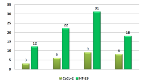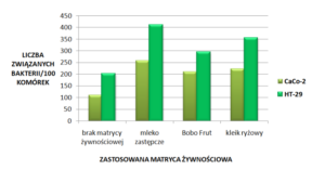 Liczba bakterii związanych ze 100 komórkami nabłonka jelitowego wynosiła odpowiednio dla CaCo-2 258 i dla HT-29 409. Najmniejszą związaną liczbę komórek, tak samo jak w przypadku analizy prowadzonej z wykorzystaniem komórek linii CaCo-2, zaobserwowano dla produktu bez zastosowania matrycy żywnościowej. W tym ostatnim wariancie w przeciwieństwie do innych (z wykorzystaniem matrycy żywnościowej) zarówno z wykorzystaniem linii CaCo-2, a także HT-29 liczba związanych komórek zmalała po inkubacji w warunkach imitujących proces trawienia w jelicie cienkim.