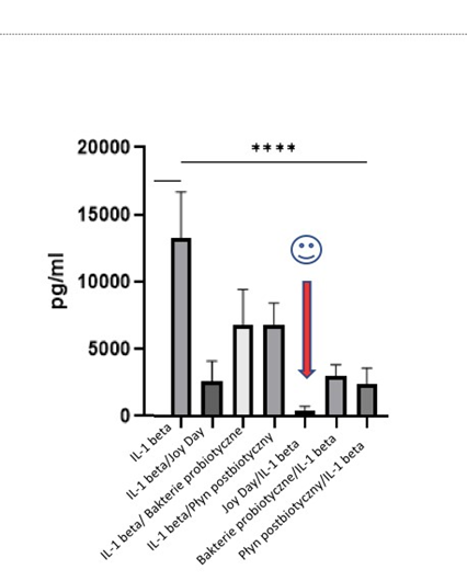 • badania przeprowadzone dla naszych produktów we współpracy z wiodącym ośrodkiem badawczym w Europie, Instytutem Immunologii i Terapii Doświadczalnej im. Ludwika Hirszfelda Polskiej Akademii Nauk we Wrocławiu wykazały STYMULUJĄCE I OCHRONNE DZIAŁANIE PŁYNNYCH PRODUKTÓW PROBIOTYCZNYCH MARKI JOY DAY NA UKŁAD IMMUNOLOGICZNY CZŁOWIEKA (wykres poniżej).